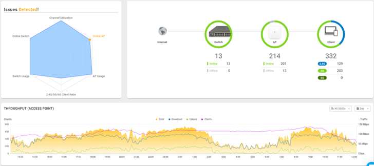 Συνολικά στον χώρο πραγματοποιήθηκε η εγκατάσταση 14 Switches τα οποία τροφοδοτούν 214 accesspoints (AP) στο σύνολο.